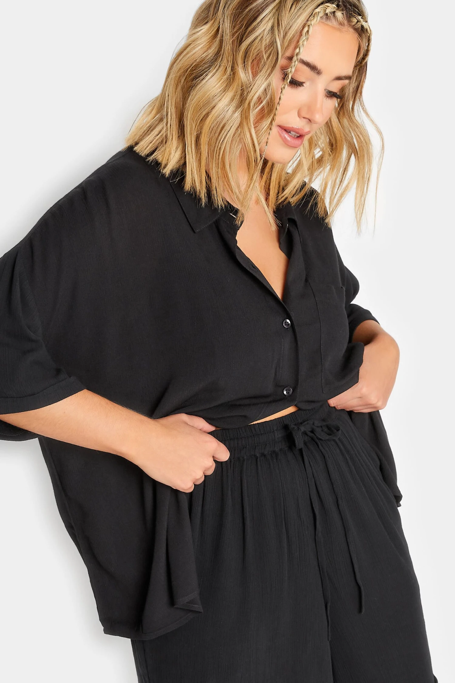 Get summer ready with the new in plus-size shorts! Featuring a crinkle look, a high waist, drawstrings and functioning pockets. Style with the matching co-ord shirt and trainers for a relaxed and fashionable look!