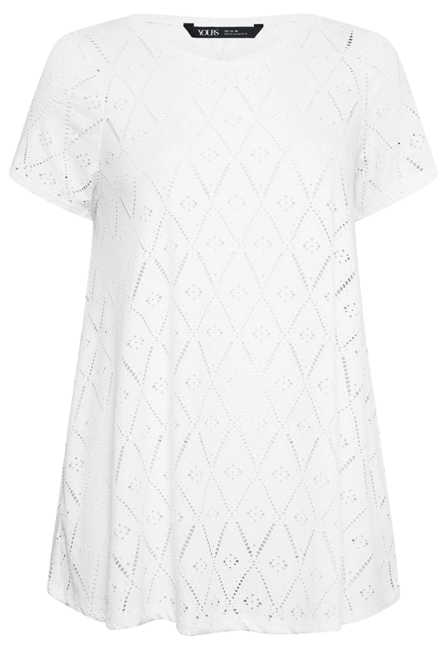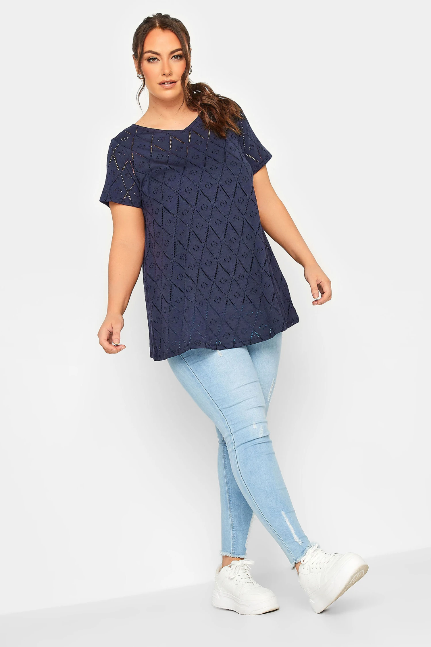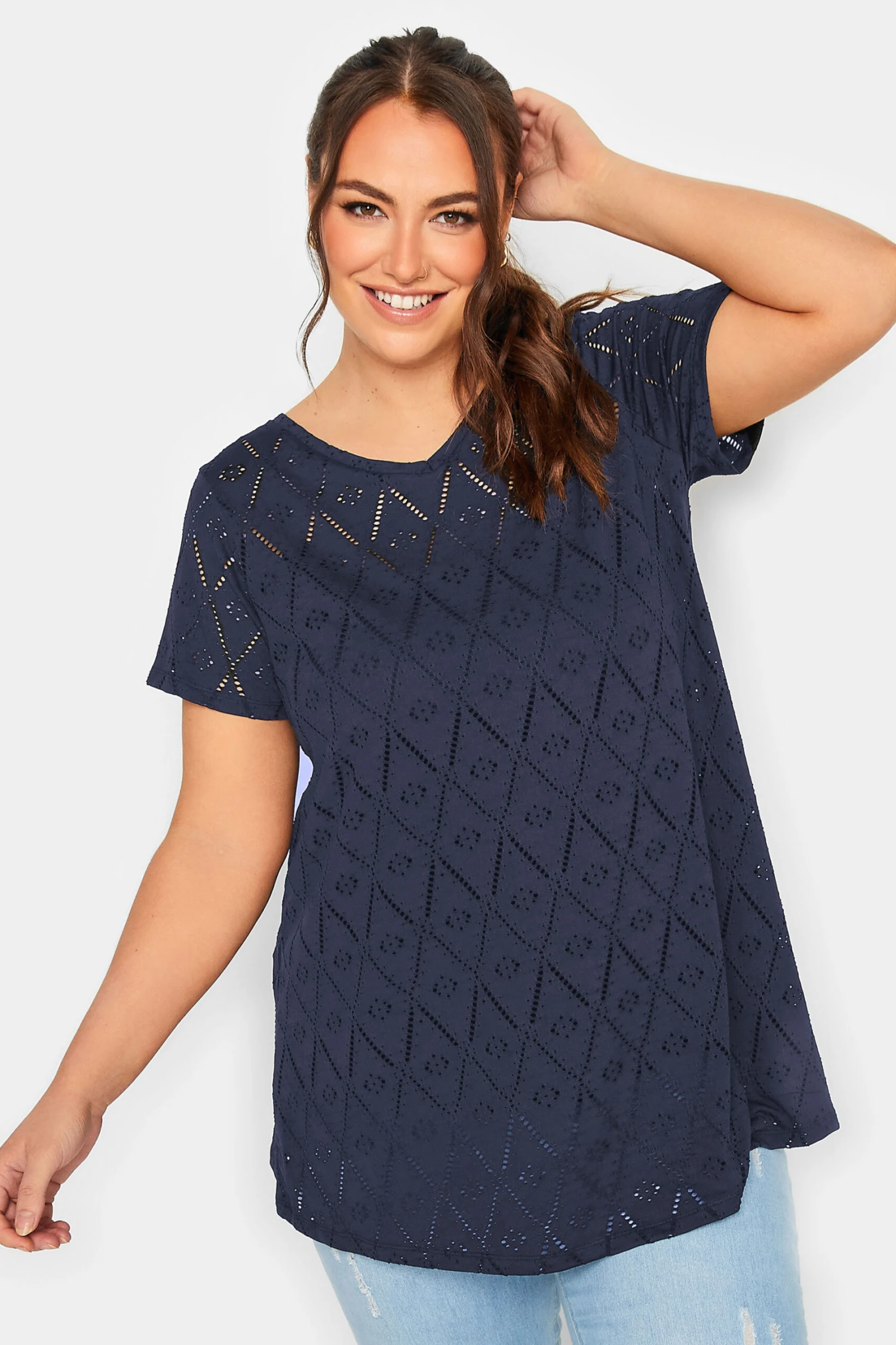 These new-in swing tops were made for dress down days. Made from a comfortable jersey fabric, they feature broderie anglaise detail with short sleeves and a v-neckline. Complete the look with jeans and a trainers for easy off-duty appeal.