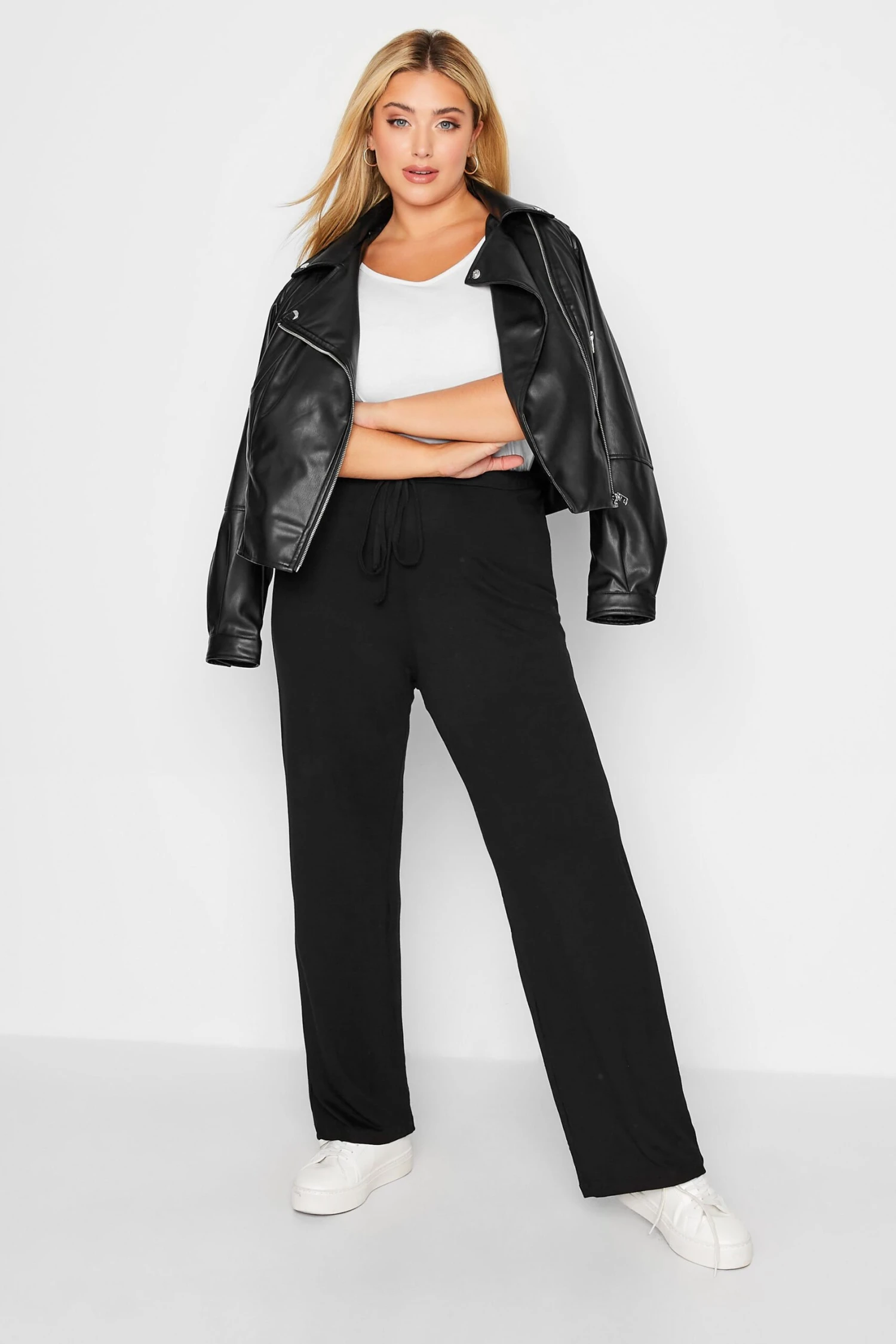 These super comfortable plus size yoga pants are designed with a self tie fabric to the centre and elasticated waistband for an easy fit. Made from a stretchy jersey fabric that is perfect for lounging and for indoor exercise classes. Style with a t-shirt and trainers for a casual look.