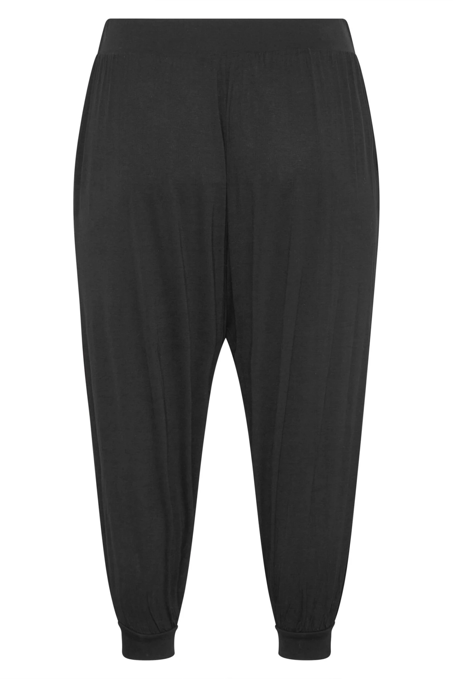 Keep it cool and casual. These plus size cropped trousers are made in a comfortable jersey and feature an elasticated waistband in a harem style. Partner with a basic t-shirt and trainers for easy everyday wear.