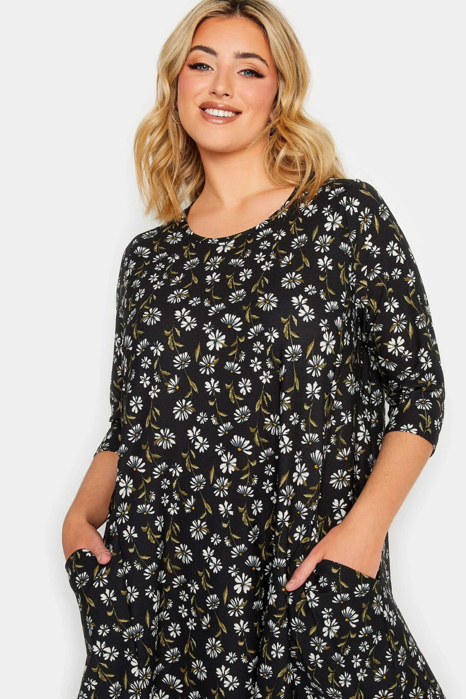 Start the new season in style with this plus-size daisy print dress. Made from a stretch jersey fabric, it features a scoop neckline, 3/4 length sleeves and two side pockets, complete at a mini length. Finish the look off with sandals.