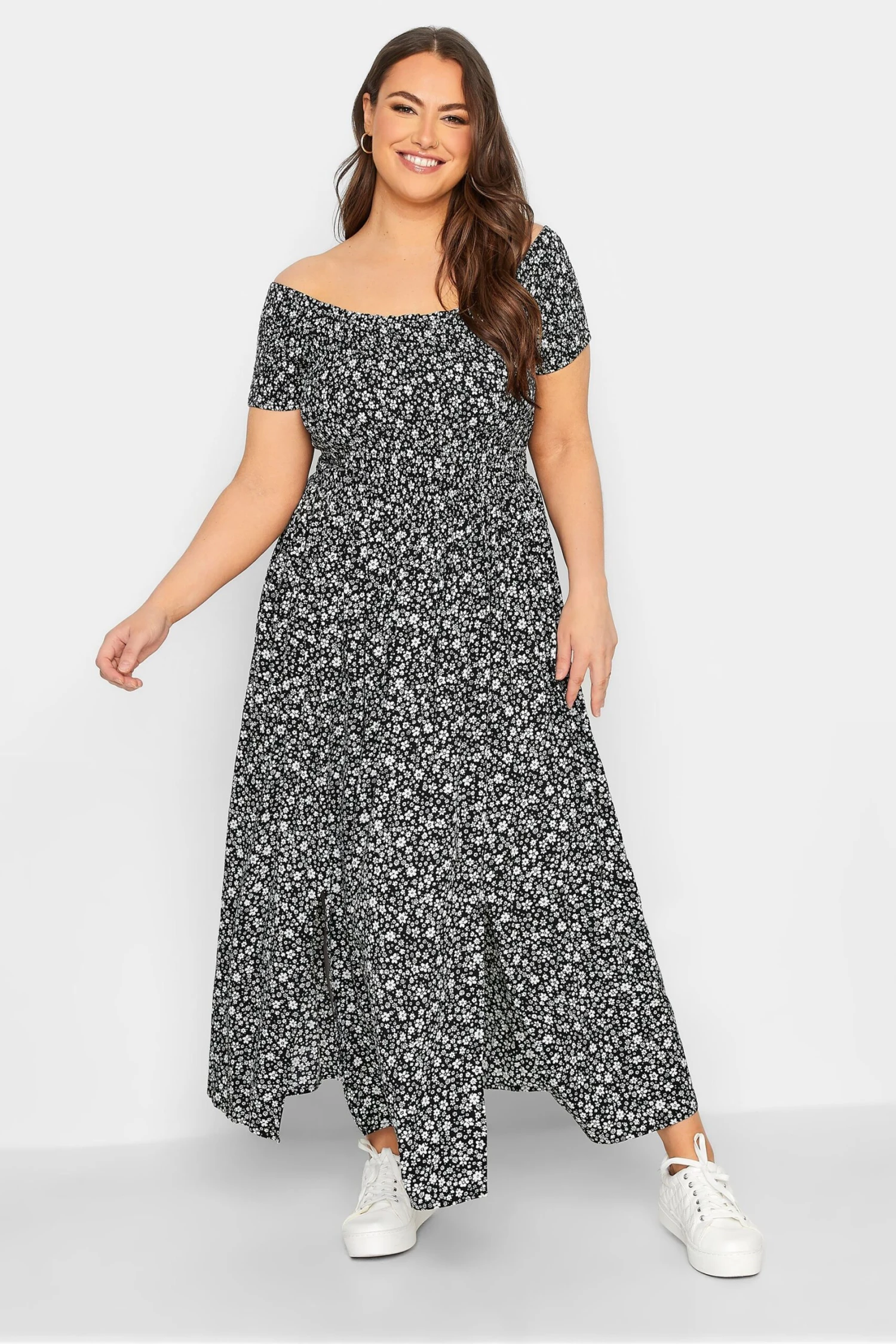 This new-in floral maxi dress is perfect for the summer ahead. Featuring a bardot neckline, shirred upper fabric and short sleeves in a comfortable woven fabric. Style with sandals or heels for every occassion.