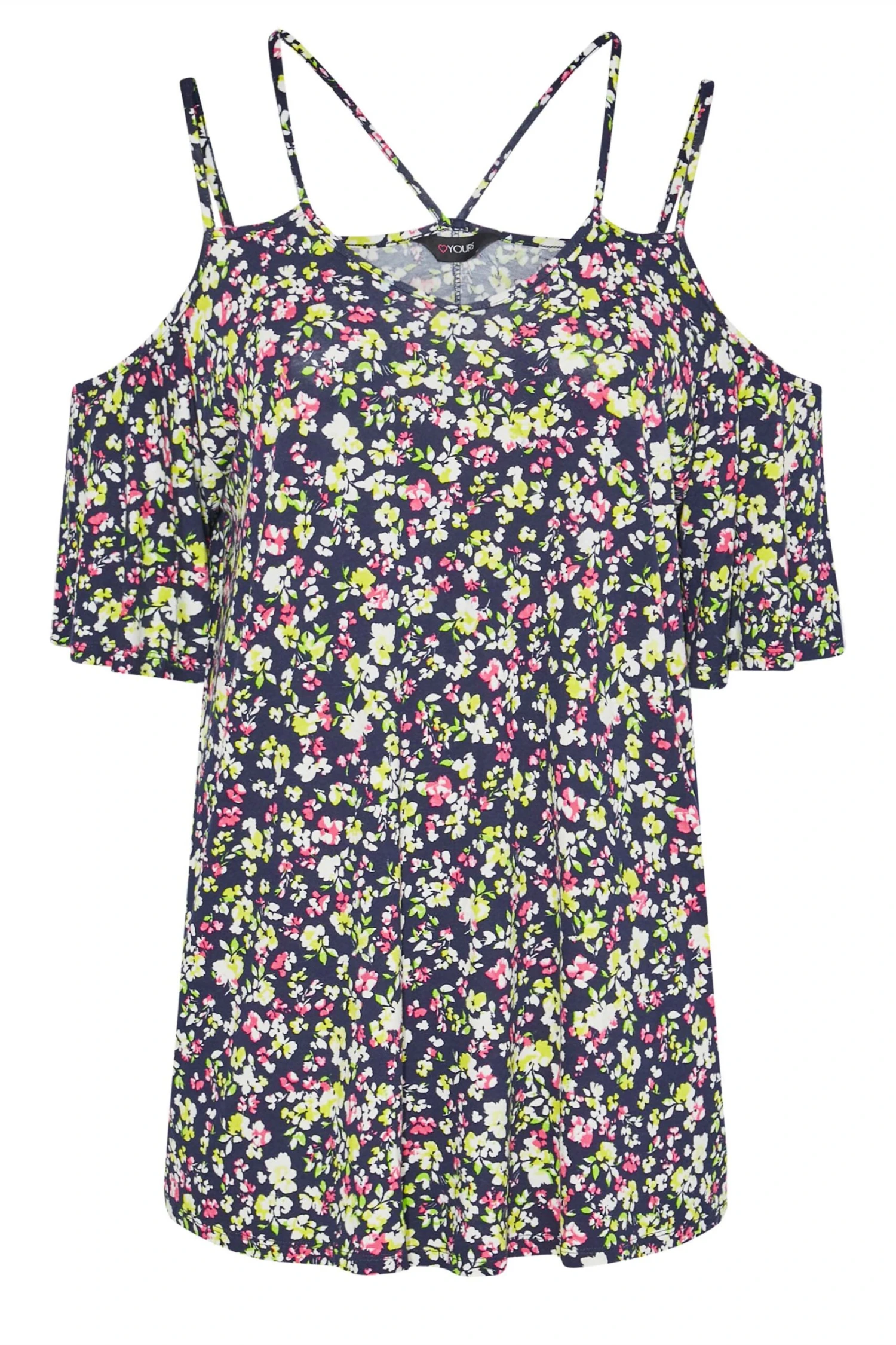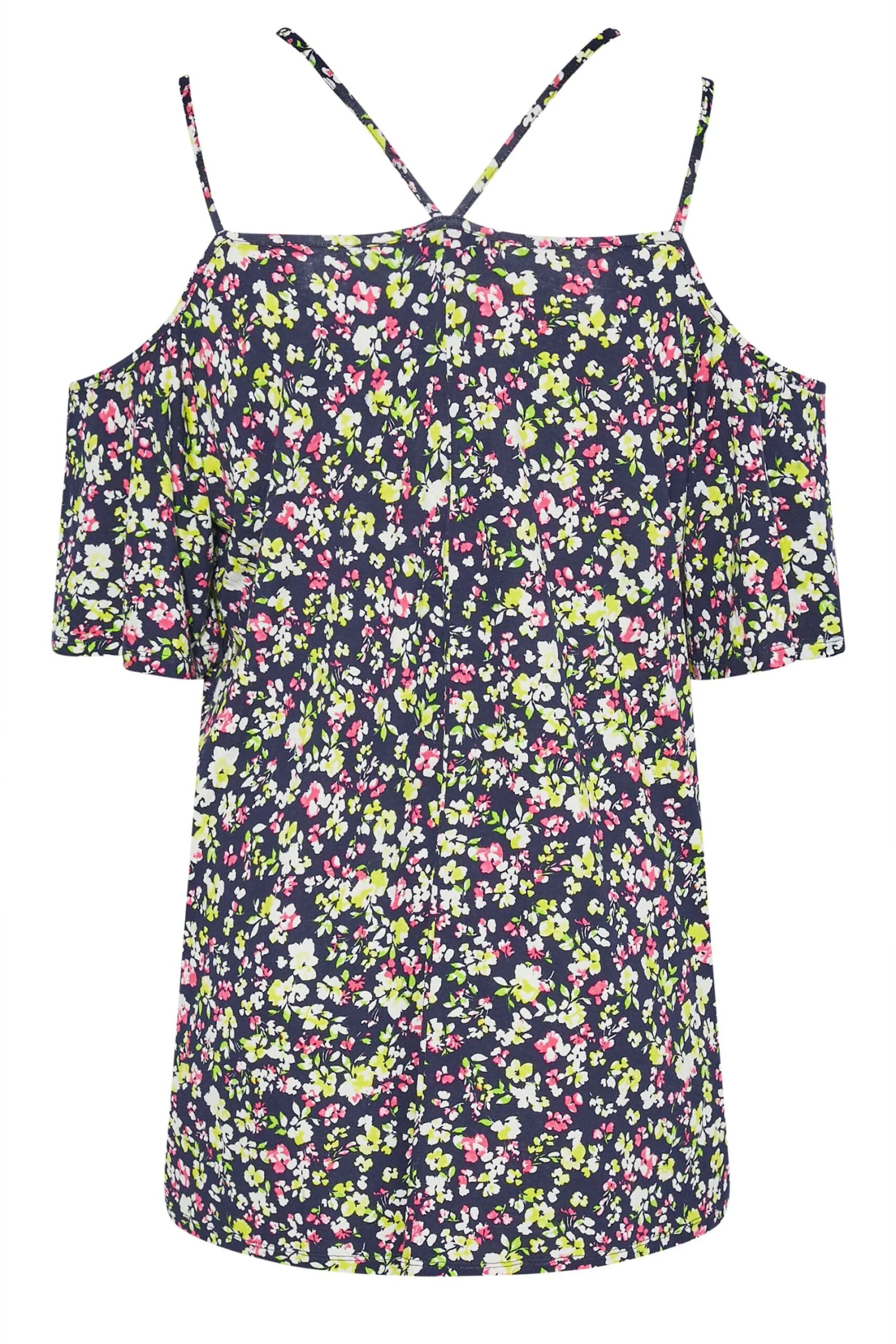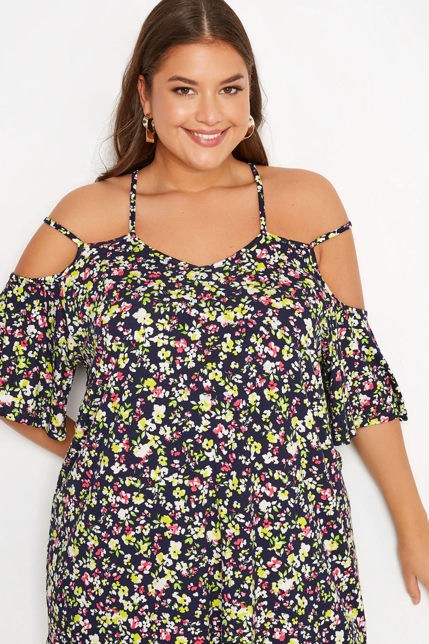 Get ready for summer with this plus size cold shoulder top. Made from a comfortable jersey fabric, it features short flared sleeves, a v-neckline and an all-over floral print. Pair with jeans and sandals for a casual yet stylish outfit.