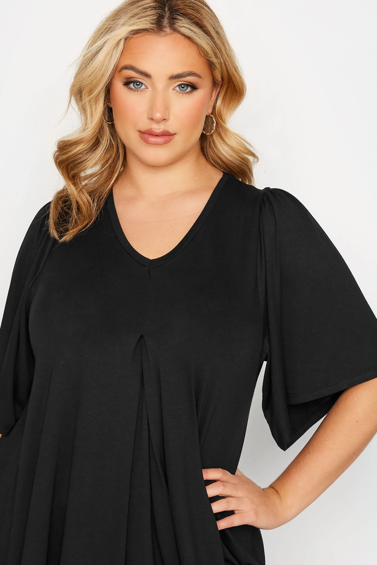This angel sleeve top is a must-have for your wardrobe. Made from a comfortable jersey fabric, it features short angel sleeves, a v-neckline with a pleat front and is complete in a swing style. Pair with skinny jeans and trainers for an off-duty weekend look.