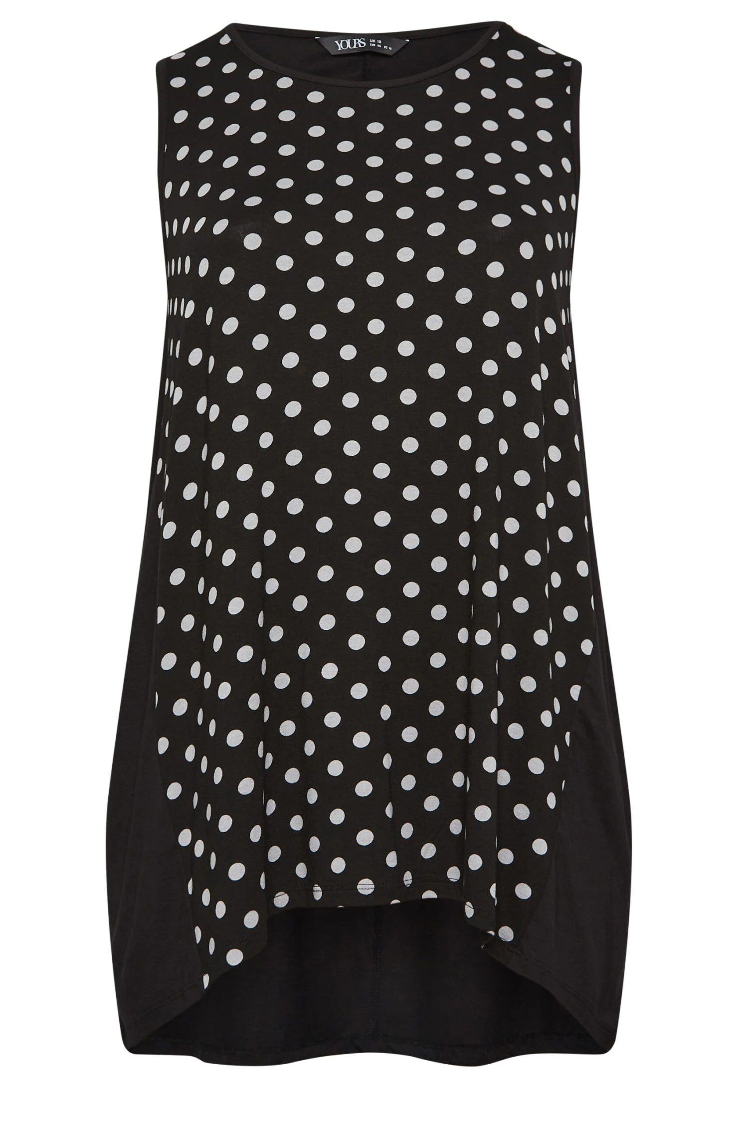 This new-in vest top is a must-have addition to your wardrobe. Made from a stretch jersey fabric, it features a scoop neckline in a sleeveless design with a polka dot print front, complete with a dipped hem. Team with denim shorts for a daytime summer look.