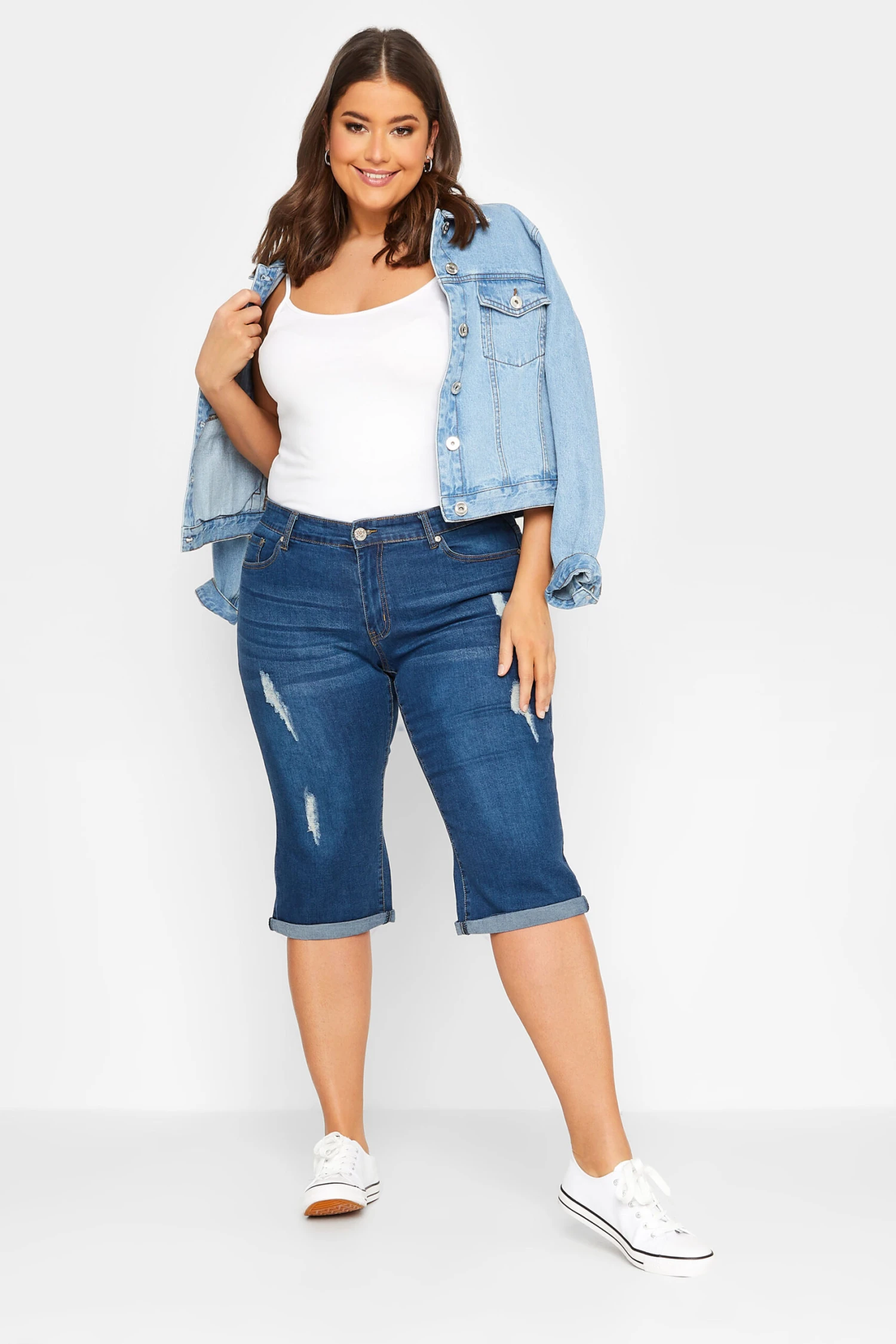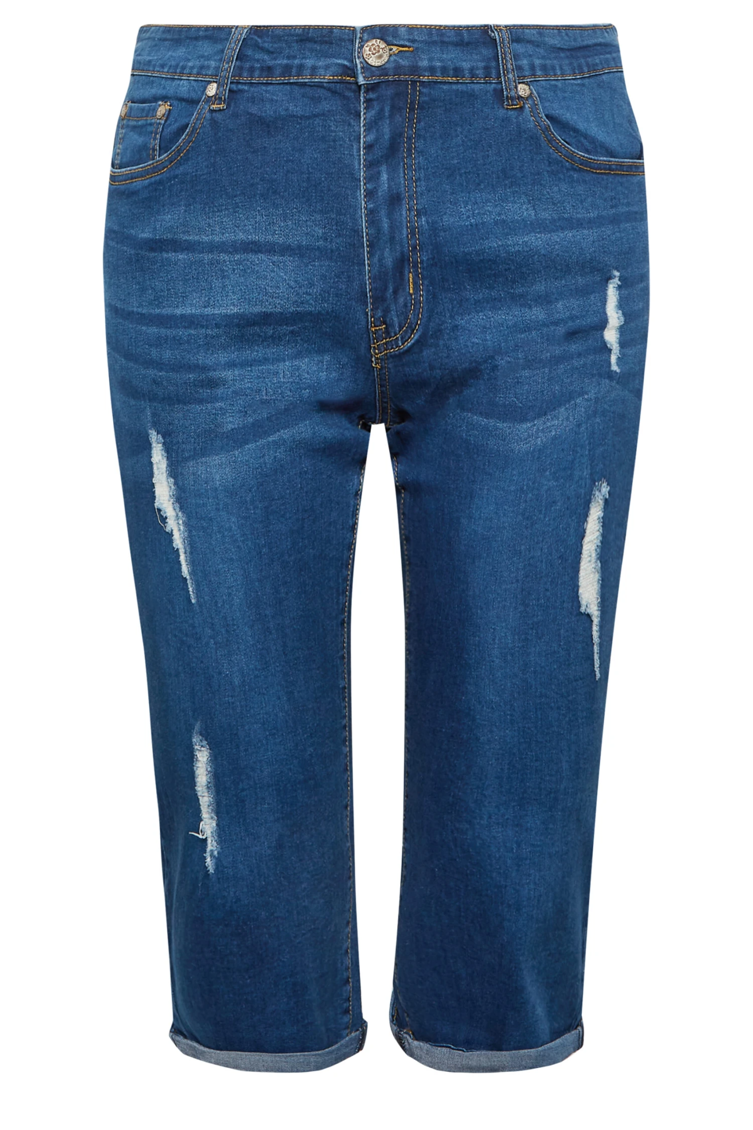 Get ready for the warmer weather with these new-in capri shorts. Made from a stretch denim fabric, they feature 5 functional pockets, belt loops and a zip & button fastening, complete in a distressed effect. Pair with a t-shirt and trainers for a casual holiday outfit.