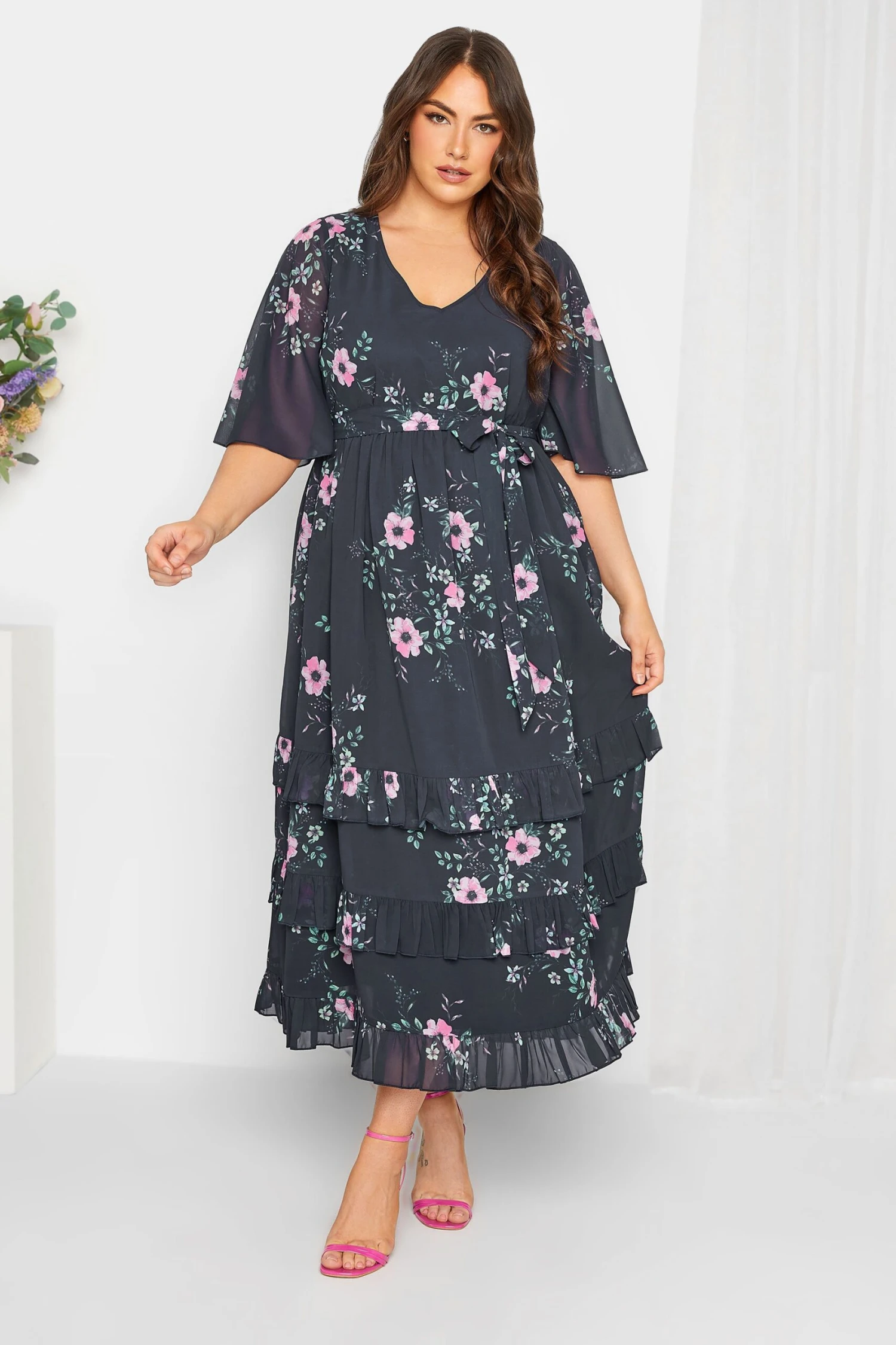 This Yours London plus size dress is a must-have for your next occasion! Made from a comfortable woven fabric, this dress features short sleeves, a floral design, a v-neckline, and a ruffle hem. Style with heels and a shoulder bag for the perfect evening look.