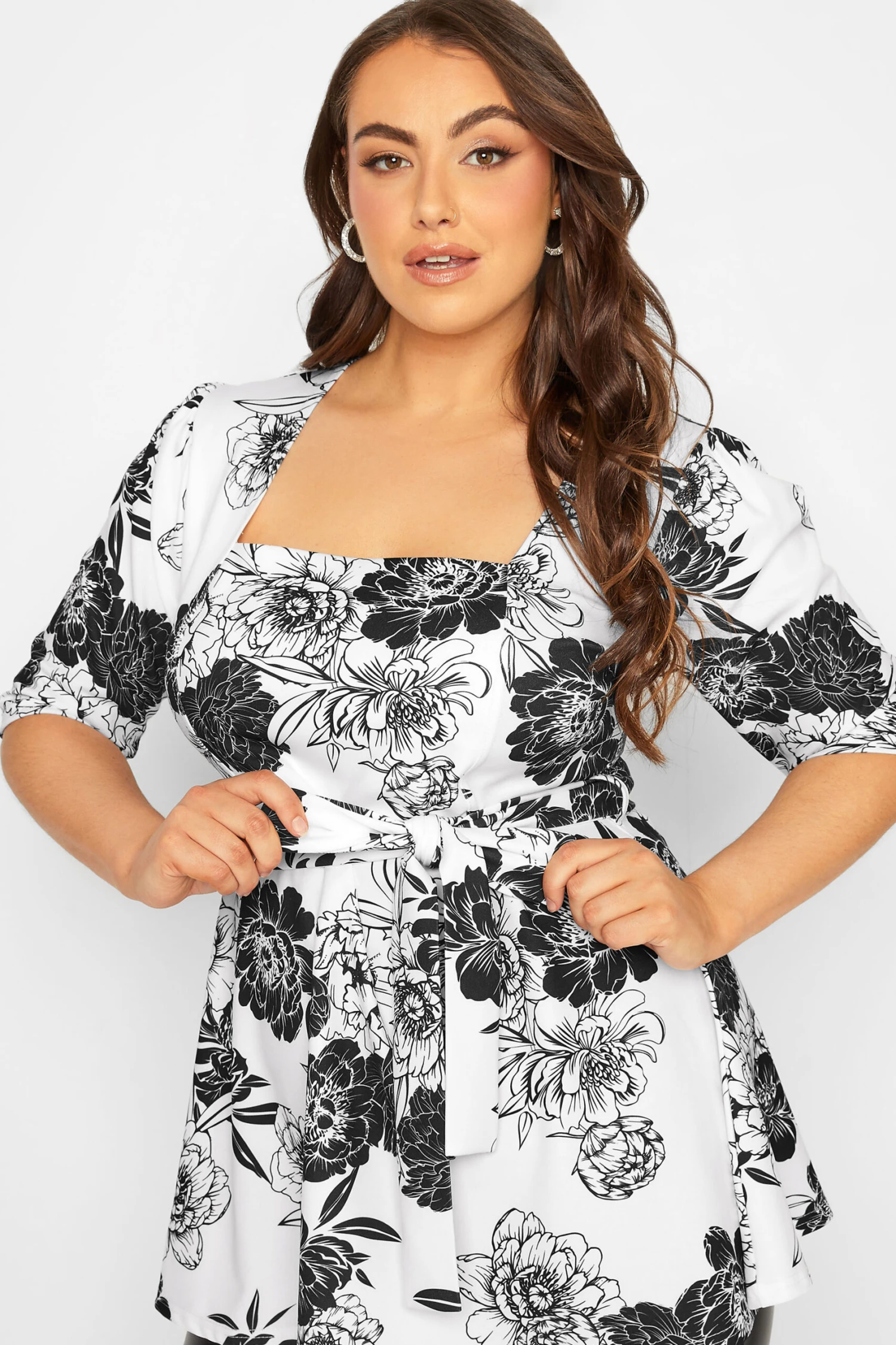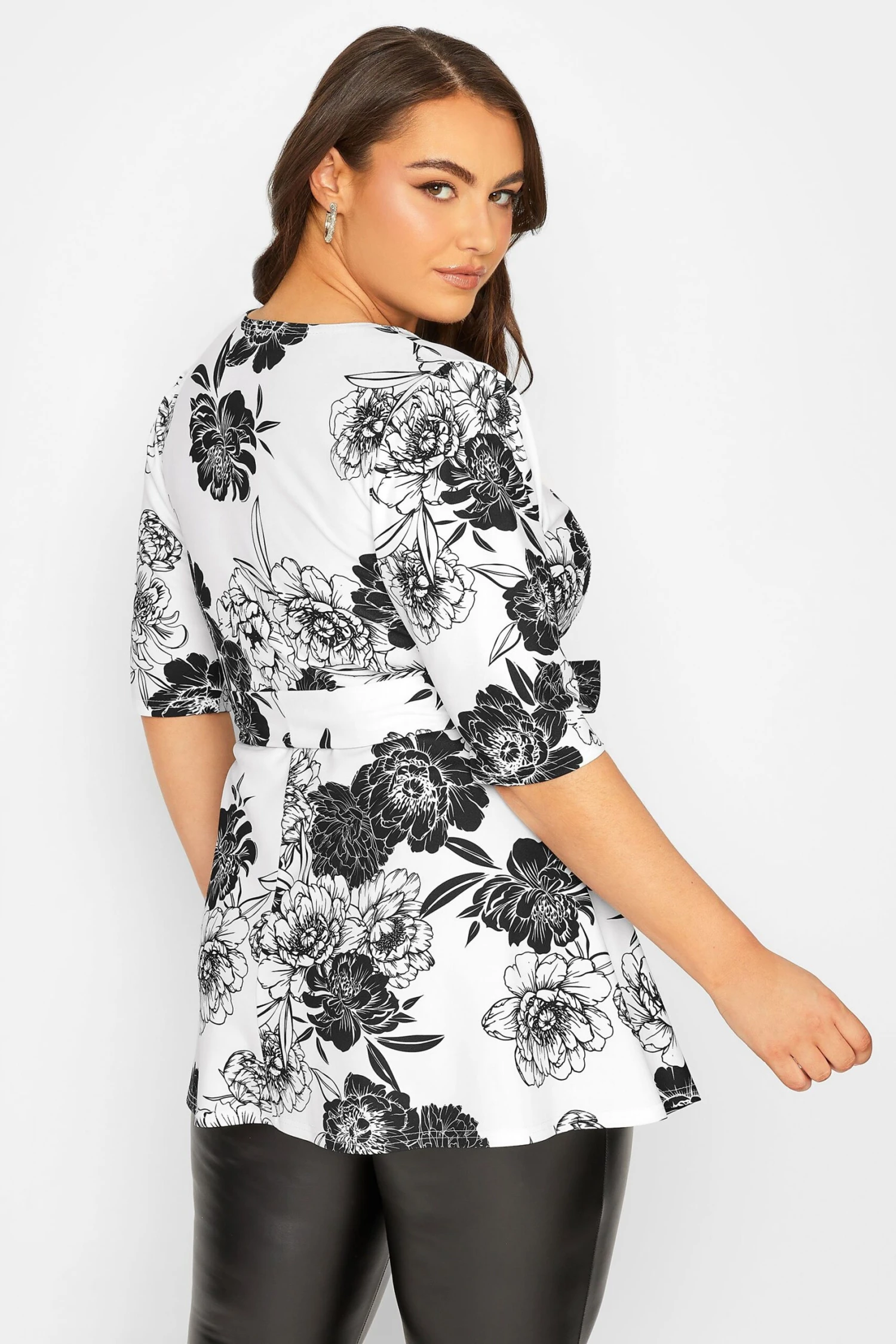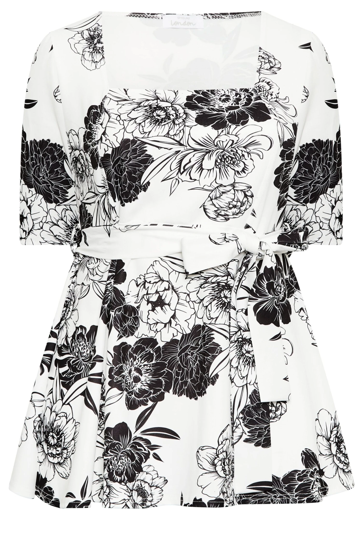 Going out this weekend? Refresh your wardrobe with this Yours London peplum top. Made from a stretch jersey fabric, it features a square neckline, short sleeves and an adjustable tie waist, complete in a floral print design. Style with leather look leggings and heels to look and feel your best.