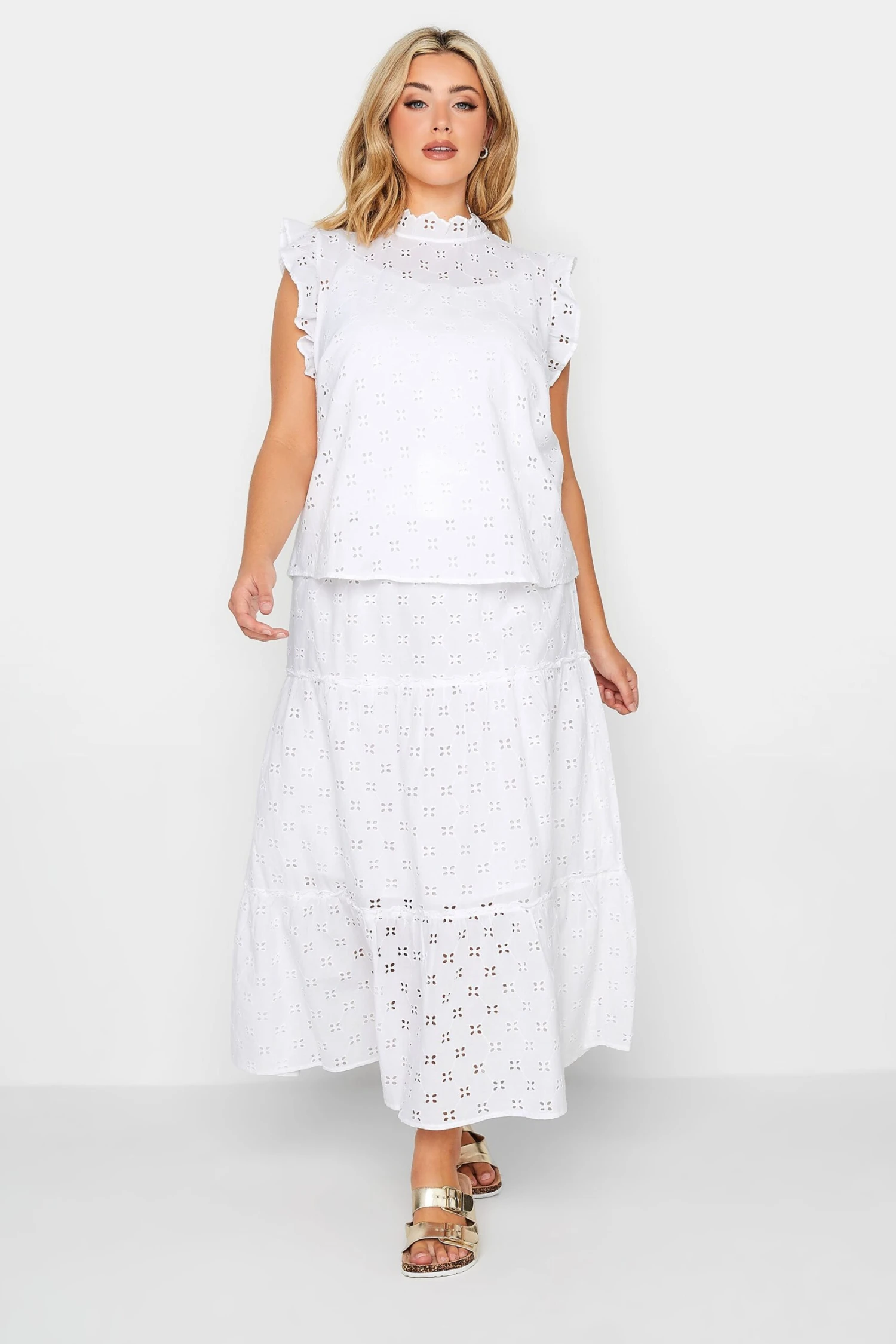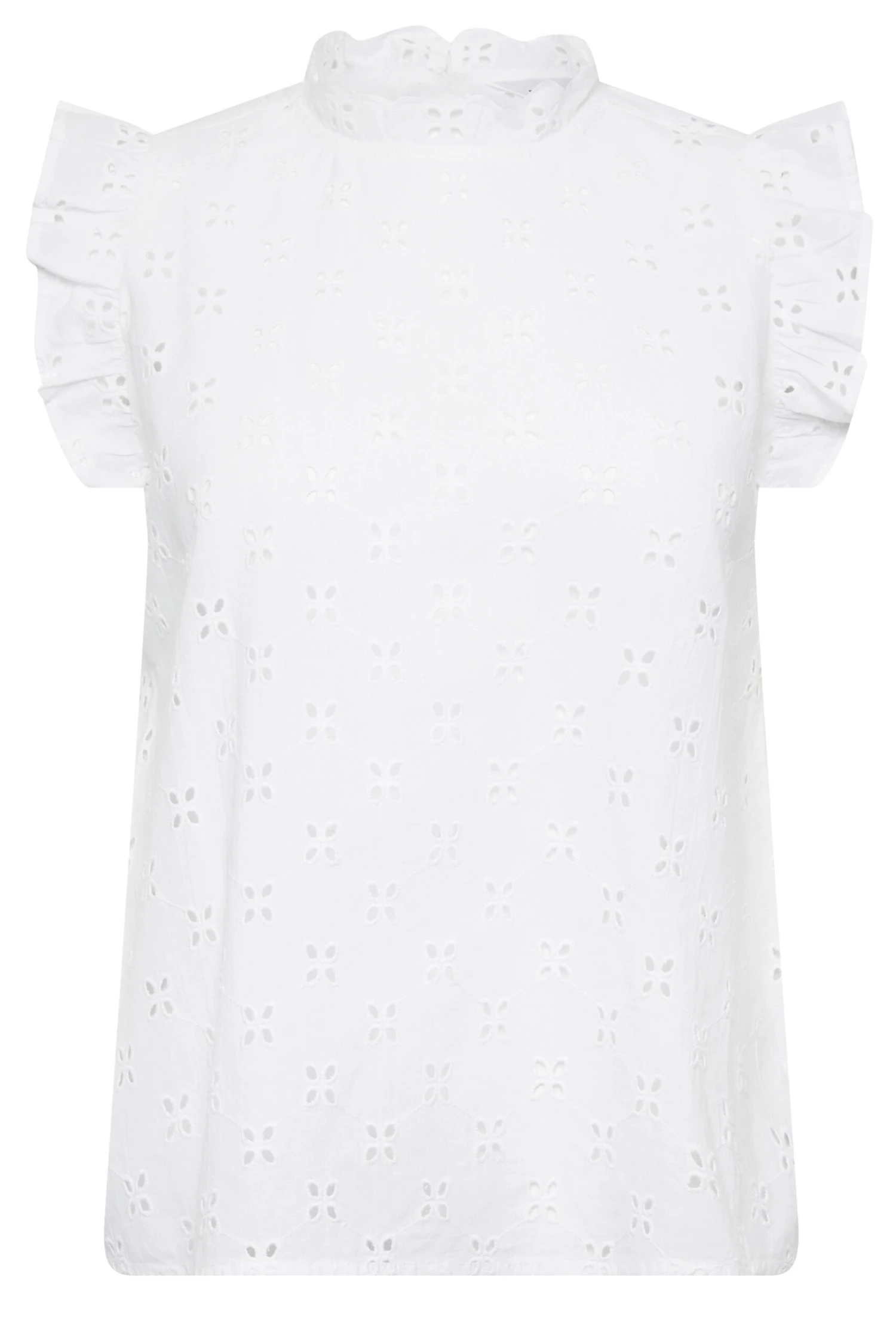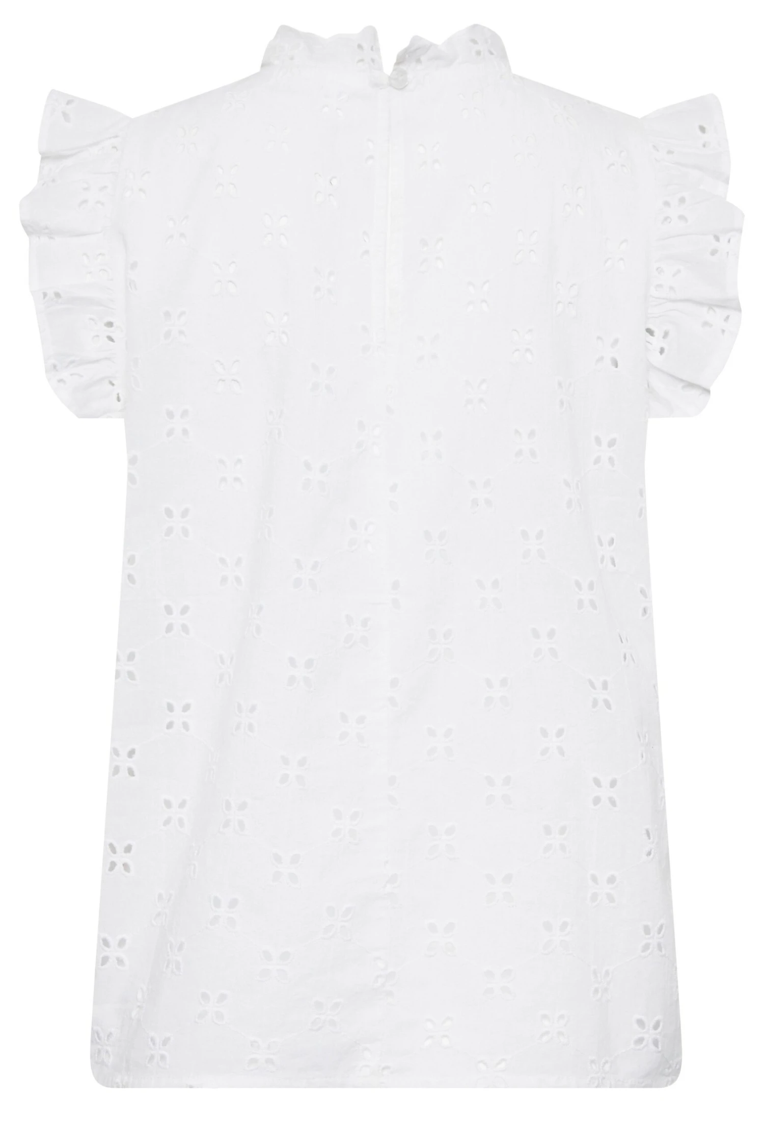 Feel feminine in this new-in petite broderie top. Made from 100% cotton, it features frill shoulder detail with a high scalloped neckline and a back keyhole button fastening. Simply style with jeans and trainers for a weekend look.